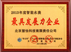 2013年华立杯在中国智能水表企业执行榜中,荣获“2013年度智能水表最具发展力企业”奖!慧怡科技专注水表行业20年,一直致力于前沿技术研究,拥有50余项具有自主知识产权的先进水表产品。
